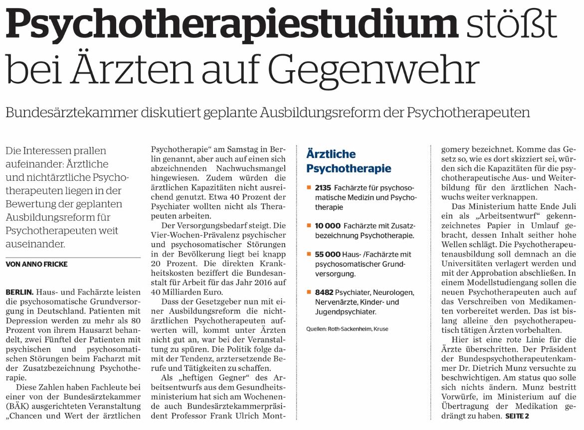 Die Psychotherapeutenausbildung soll an die Universitäten verlagert werden und mit der Approbation abschließen. In einem Modellstudiengang sollen die neuen Psychotherapeuten auch auf das Verschreiben von Medikamenten vorbereitet werden. Ist hier eine rote Linie für die Ärzte überschritten worden?