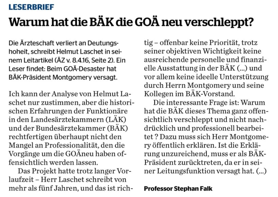 Bitte lesen Sie dazu auch den Beitrag von Herrn Laschet (Ärzte Zeitung) unter der Kategorie "Das sollten Sie wissen": Die Ärzteschaft verliert an Deutungshoheit.